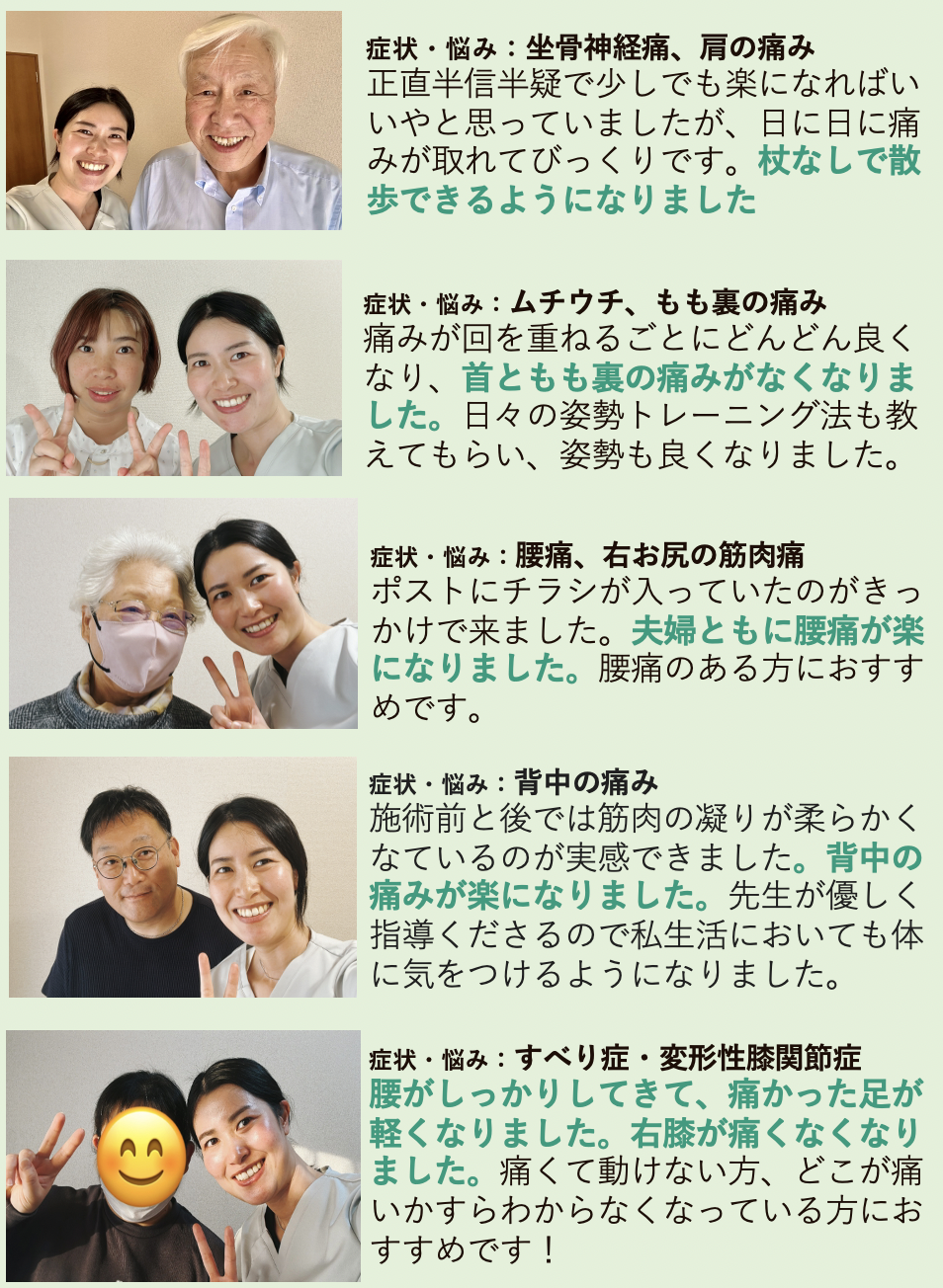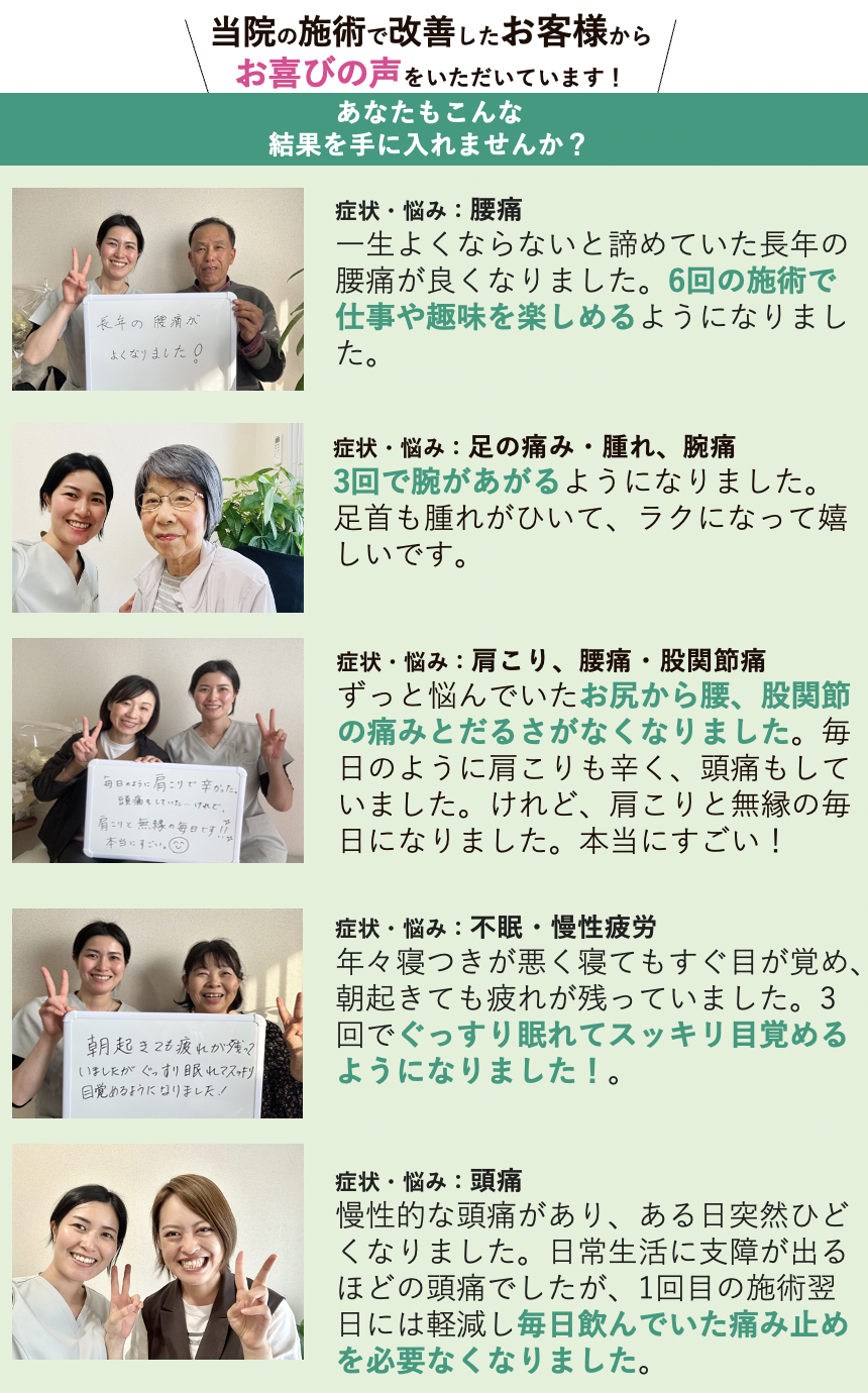 病院でも、整骨院でも、治らなかった痛みが5回の通院で改善されたのです!